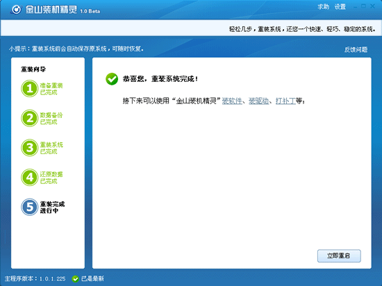 第五步:在还原数据之后,重装系统完成,此时需要您重启下电脑。另外您还可以使用金山装机精灵的其他功能:装驱动、装软件、打补丁。