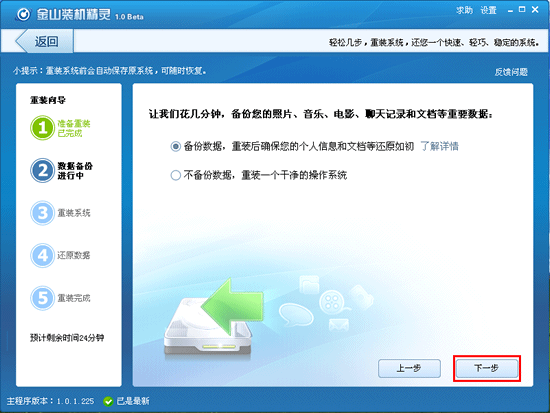 重装系统完成,电脑重启后进入桌面,自动启动金山装机精灵。点击“下一步”,进行数据还原。