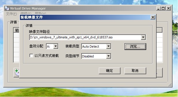 6、装载映像文件:点击装载,找到你的U盘上的ISO文件,路径浏览记住虚拟盘符为A,确定后,最小化放在任务栏边