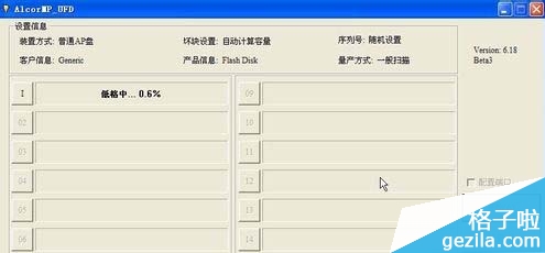四、下载之后运行软件,软件会显示插入u盘信息,然后点击开始按钮开始低格。这里小编使用的是AlcorM_UFD。