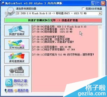 一、我们首先要检测U盘是不是扩容过的,这一步非常简单,下载使用mydesktest这一个工具,插上U盘然后运行软件选择快速扩容盘检测,这里刚好我有个扩容盘做测试,可见结果提示该盘为512m的盘扩容成1g的。