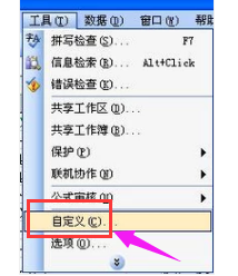 打开打开excel,选择工具——点击“自定义”。这时会出现一个“自定义”表单,不要理会这个表单,上面没有可供选择的项目。