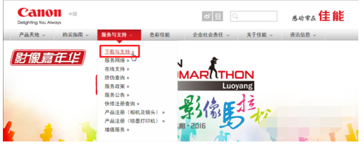 1,进入佳能(中国)官网页面,选择“服务与支持”,选择“下载与支持”