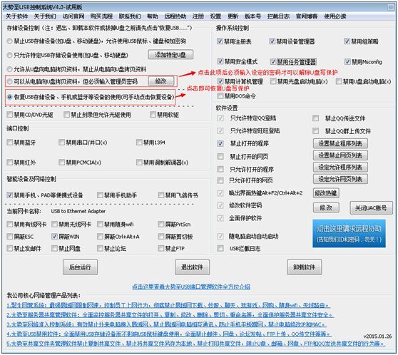 第三、如果你想更简单,就用专门的电脑U盘写保护解除软件来实现,例如有一款“大势至USB接口管理软只需要勾选“恢复电脑USB存储设备、手机和蓝牙的使用”即可成功解除U盘写保护功能(如下图所示);同时,还可以对去除U盘写保护进行密码加密,也就是必须输入密码才可以解除U盘写保护,从而进一步保护了U盘的安全,也可以防止特定情况下复制电脑文件到U盘的行为。此外,本软件还可以有效禁止U盘使用、屏蔽USB存储设备以及防止通过发邮件、网盘、FTP上传和QQ发送文件等方式将电脑文件发送出去的行为,全面保护了电脑文件的安全。