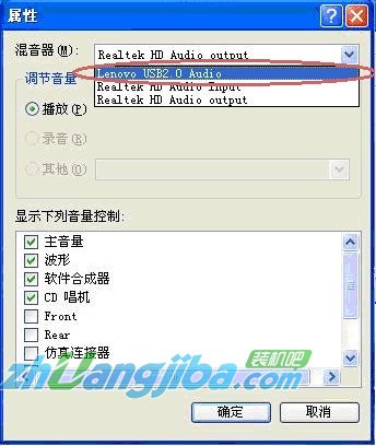 5. 在打开的属性窗口里面,点击混音器下拉菜单,选择Lenovo USB2.0 Audio ,之后点击确定。
