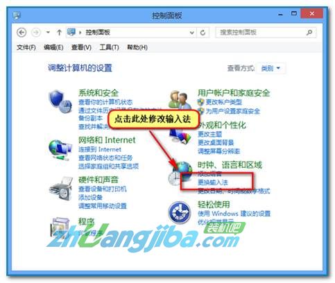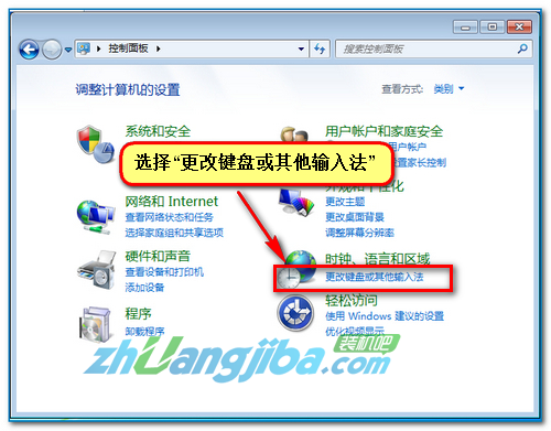 打开控制面板,查看方式“类别”视图下选择“更改键盘或其他输入法” ;