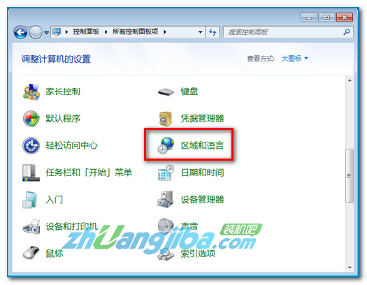 “图标”查看方式下选择“区域和语言” ;