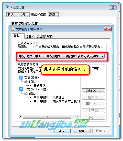 “默认输入语言”选择其他的输入法或“美式键盘”(此为英文状态),如下图: