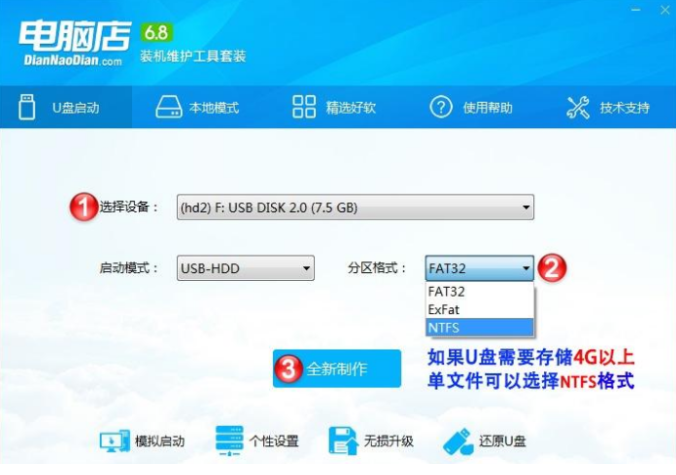 1、右击下载好的电脑店U盘启动盘制作工具,选择以管理员身份运行。插入U盘,选择U盘盘符,分区格式一般选择NTFS,点击全新制作