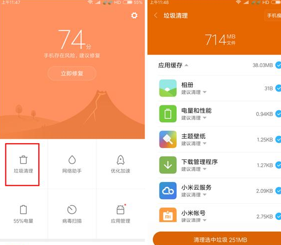 1.使用手机随附的手机管家查找垃圾清理功能,然后单击“扫描”进行清理。