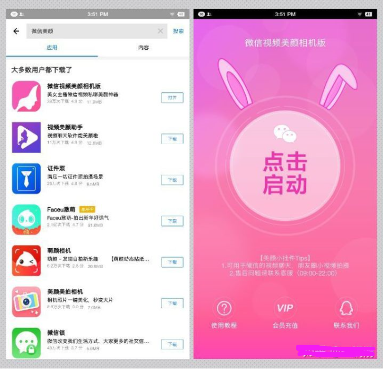 2、首先,我们在腾讯应用宝中搜索微信视频美,我们将搜索微信视频美相机版本,该软件可以完美满足我们微信视频聊天美的需求,但如果您仍然尝试该软件,则只能试用30分钟。需要稍后付款。