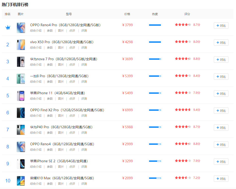 从图中可以看出2020热门手机排行榜的前十名是: