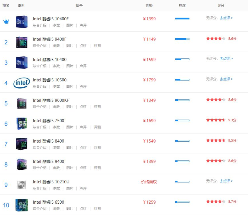 从图片中可以清楚地看到,最受欢迎的i5处理器型号是:Intel Core i5 10400F,第二个是:Intel Core i5 9400F,第三个是:Intel Core i5 10400。