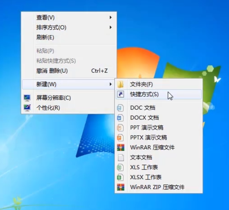 1、在系统桌面右键空白处,选择新建一个快捷方式。