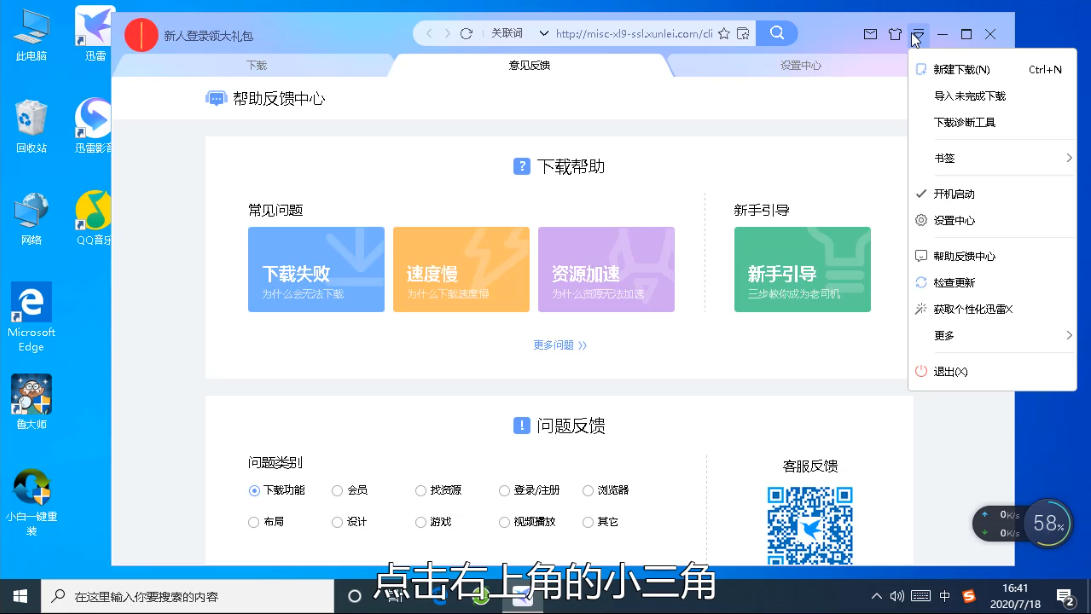 1、首先打开迅雷下载软件,然后点击右上角的小三角(菜单)