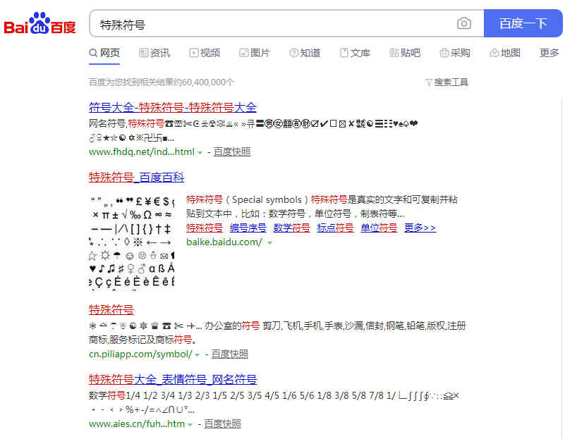 1、百度搜索特殊符号。通过百度搜索我们可以搜索专业的网站提供的特殊符号,通过这些符号内容我们就可以进行复制输入。
