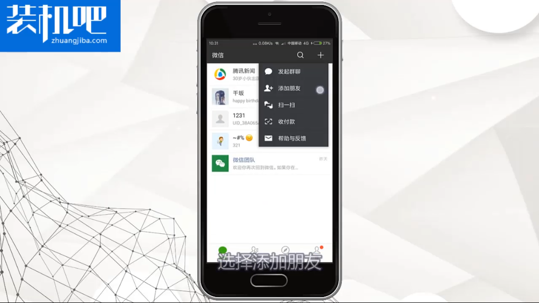1、打开微信,点击右上角的加号,然后点击添加朋友。