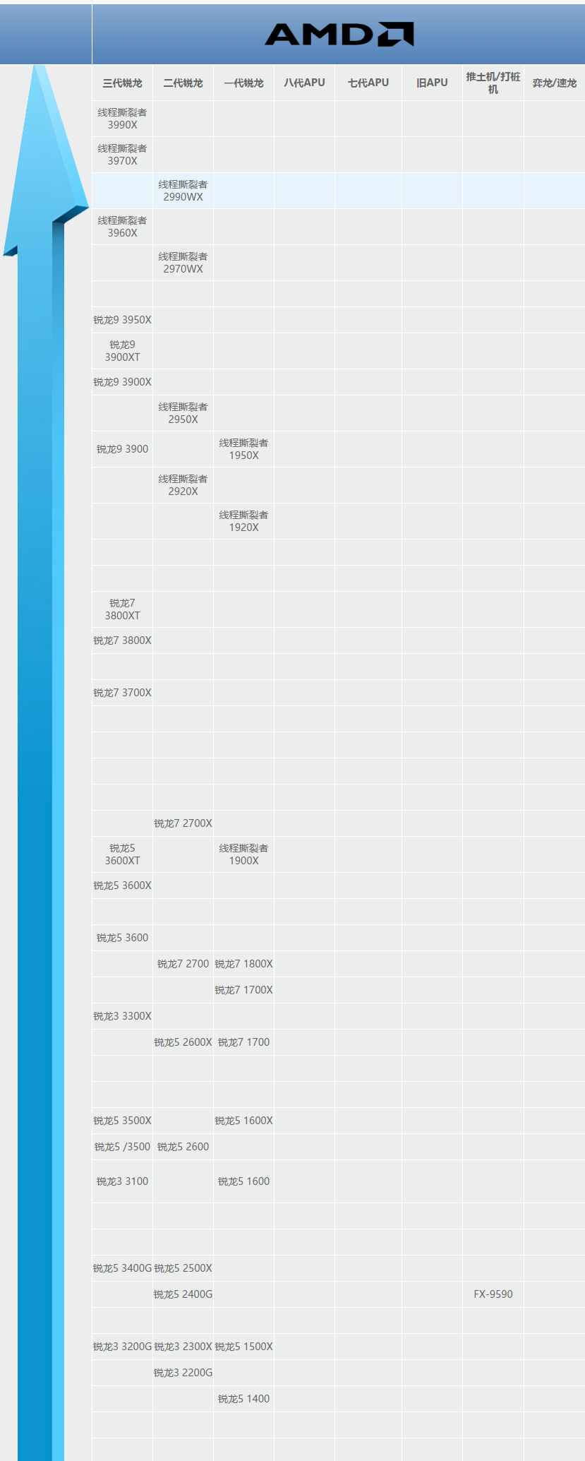 1、我们先来看看上半部分的天梯图,都是一二三代的锐龙,其它显卡只有推土机是有一个型号的。