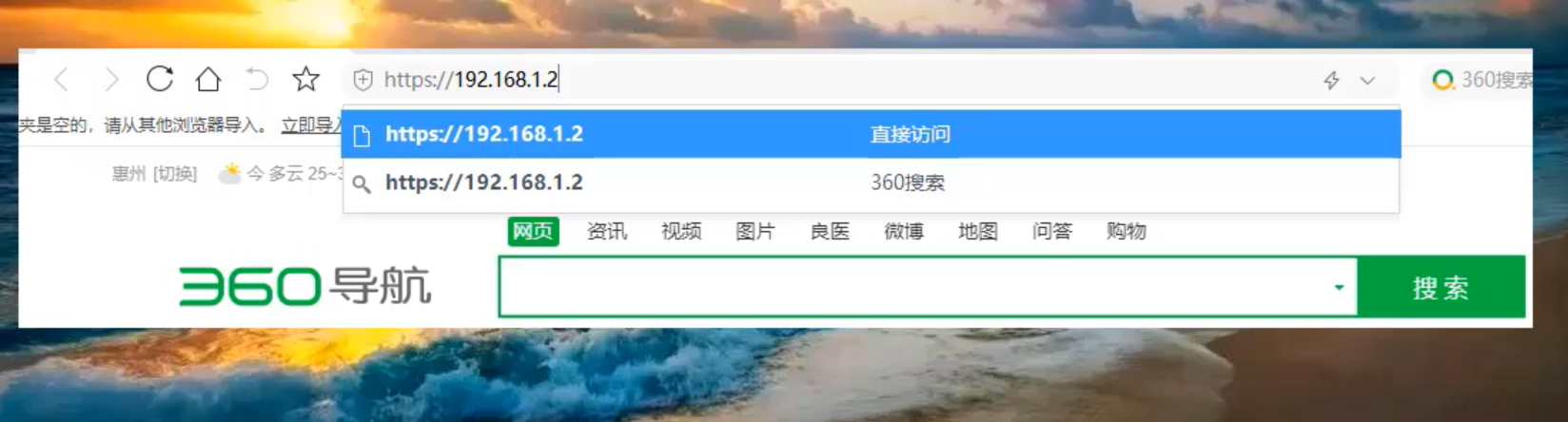 1.打开360浏览器,输入https://192.168.1.2
