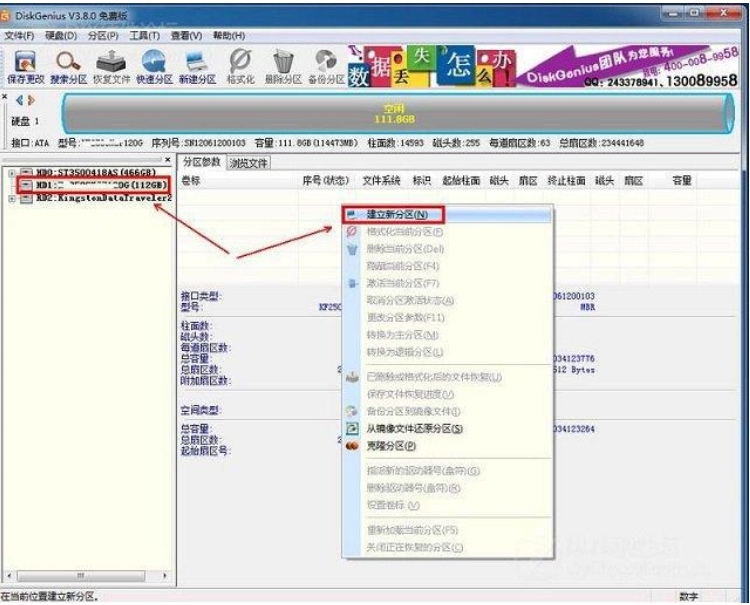 1. 首先在电脑或PE工具中,打开DiskGenius软件,然后在左侧,选中需要分区的新硬盘,之后可以看到,上方显示的是空闲的灰色条,右键点击这个灰色条,选择建立新分区。