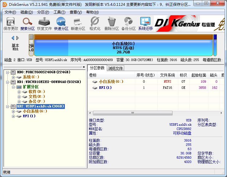 1、下载个 DiskGenius 分区工具,插上您的 U 盘,您可以在软件的左侧列表中看到您的 U 盘。