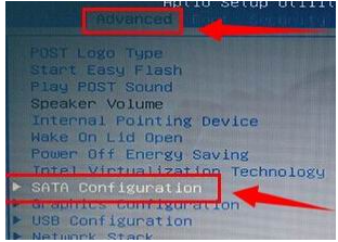 1、首先启动惠普笔记本,接着在键盘上面按【F2】进入bios设置窗口,进入之后运用左右方向键将光标移至【advanced】菜单,再用上下方向键将光标移至【sata configuration】按键盘上的enter回车键执行。
