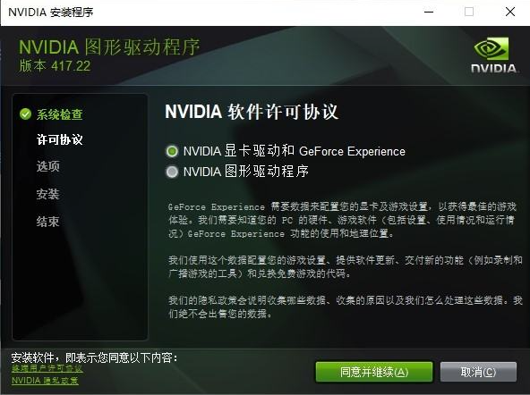 第一个选项是安装显卡驱动(就是图形驱动)和 geforce experience(显卡驱动自动更新程序);而显卡驱动不建议经常更新,驱动程序不是越新越好,而且符合硬件上市时间段的驱动才是最适合这个硬件的驱动程序,过高的驱动程序会引起显卡工作异常。