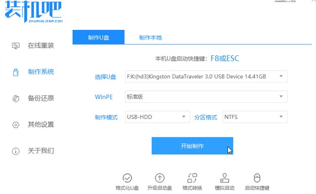 1.插入u盘,打开软件,点击制作系统,点击开始制作。