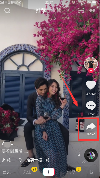 1、首先找到喜欢的抖音视频,点击有下方转载图标。
