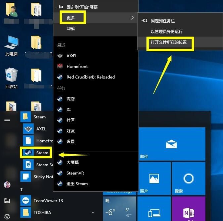 1、点击菜单栏的steam选择更多--打开文件所在位置,如下图所示。
