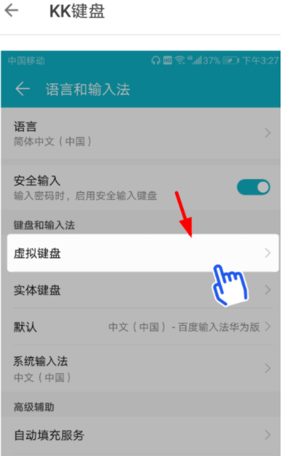 1、其实现在大家要是想关闭KK键盘,那么就应该先点击进入手机的设置页面,找到“语言和输入法”功能,从中选择“虚拟键盘”选项。