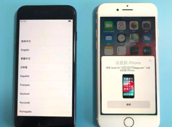 1、刚购买的新设备或者刚刷机完的设备开机后,把它放在旧设备旁边,旧iPhone升会出现设置新iPhone的弹窗,点击继续。