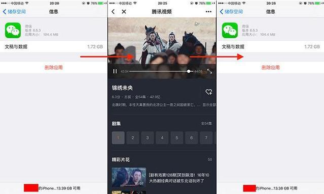 经过小编测试,在看完视频之后,内存空间没有变化;但是受听完电台之后,内存空间却明显变小了。事实上,在使用APP的时候,效果也是相似的,视频如果不主动选择缓存,看完之后是不会影响手机内存的。