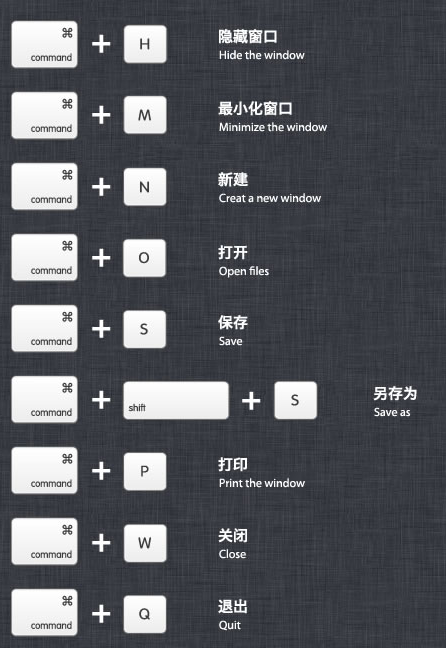 Command是Mac里最重要的修饰键,在大多数情况下相当于Windows下的Ctrl。所以以下最基本操作很好理解:
