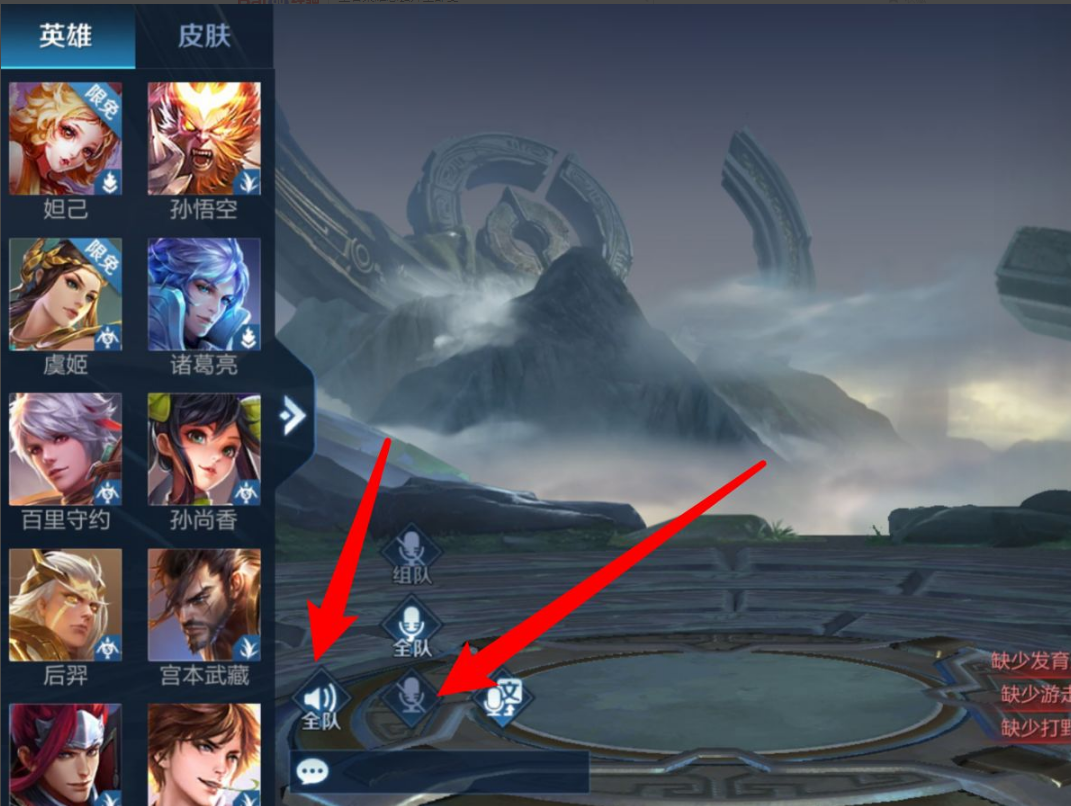 1、第一步,进入选英雄的界面,然后你看一下左下角是不是有一个像麦和像喇叭一样形状的图标,先把喇叭开起,然后再开麦,如果不开喇叭是开不了麦的哟