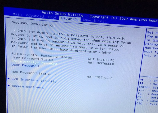 1、根据自己电脑的品牌,连续按进入Bios界面的启动热键,然后使用键盘方向键,切换到顶部菜单栏Security;