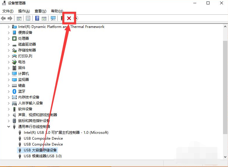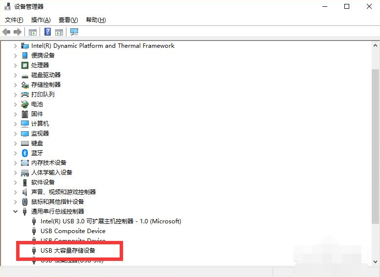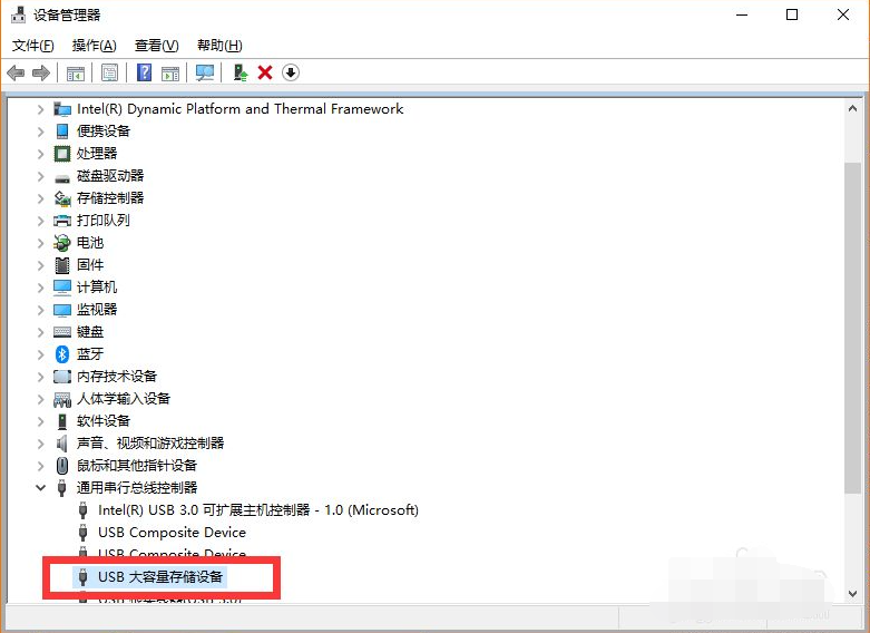 6、“USB大容量存储设备”项恢复显示。win10成功显示U盘了。