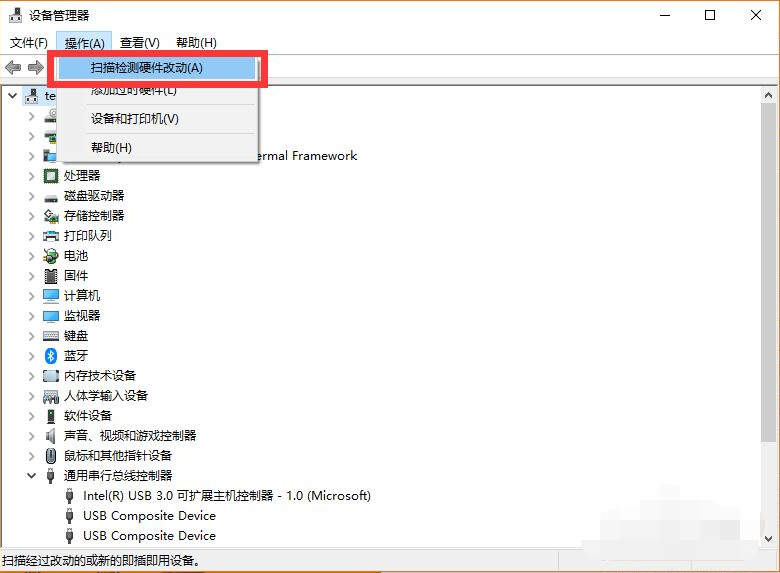 5、USB大容量存储设备”项消失后,左击“操作”,从弹出的菜单中选择“扫描检测硬件改动”项。