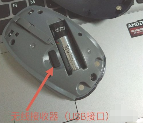 1、打开鼠标盖子:里面有电池、无线接收器、绝缘条。取出无线接收器,撕开绝缘条。