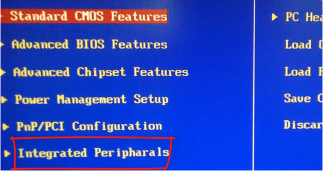 1、重启电脑,不停的敲击进入BIOS的启动热键,一般为F2、ESC、Del键,大家可以尝试一下。进入BIOS主界面,上下方向键选择integrated peripherals,回车。(不同的电脑BIOS界面不一,设置方法大体相同)
