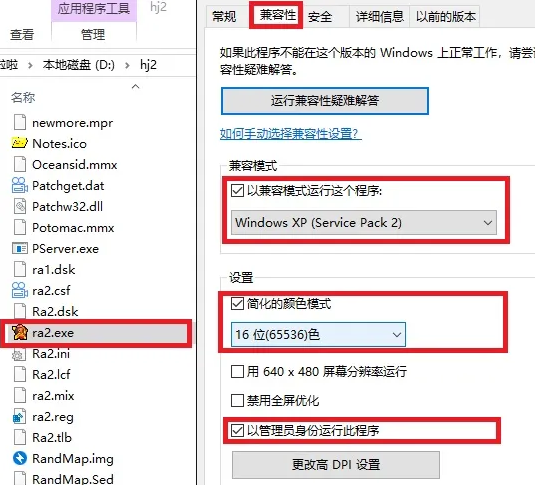 右击游戏目录的【ra2.exe】或桌面的快捷启动方式,选择【属性】,在弹出的属性界面选择【兼容性】,勾选【以兼容模式运行这个程序】,然后选择【Windows XP】,再勾选【简化的颜色模式】,选择【16位色】,最后勾选【以管理身份运行】。