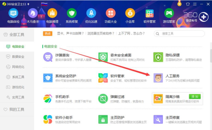 1、打开360安全卫士,进入【功能大全】界面,在【电脑安全】版块找到【人工服务】功能。
