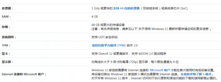 从图中来看,Win 11对电脑硬件整体要求不高,与 Win 10 系统的 2 + 32GB存储相比,Win 11需要 4 + 64GB,高了一倍,但大多数电脑配置都能达到这个要求。