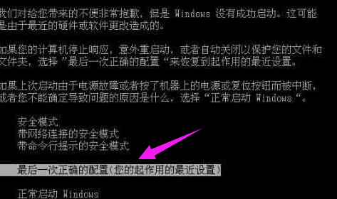 1、我们在开机时按F8不动直到高级选项出现在松手,在页面中选择“最近一次的正确配置”回车修复。