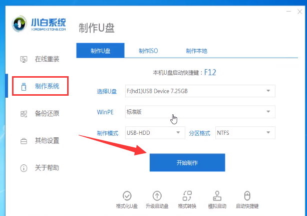 1、将空U盘插入电脑,打开小白一键重装系统软件,关闭杀毒工具(包括360安全卫士),等待小白检测环境完成后,点击制作系统,【开始制作】。