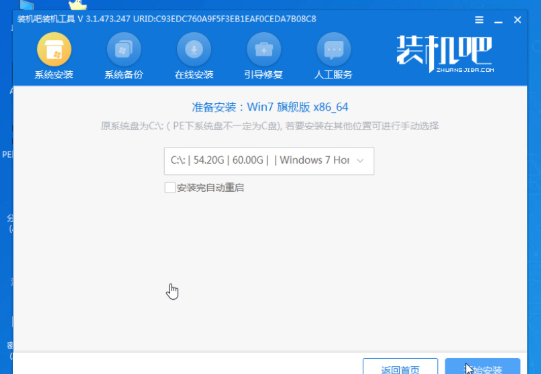 9.自动弹出装机吧工具,选择win7旗舰版系统。