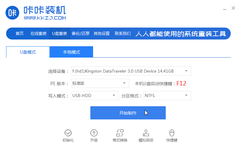 1.首先在一台可用的电脑上下载安装咔咔装机一键重装系统工具并打开,插入8g以上的空白u盘,选择u盘重装系统模式点击开始制作。