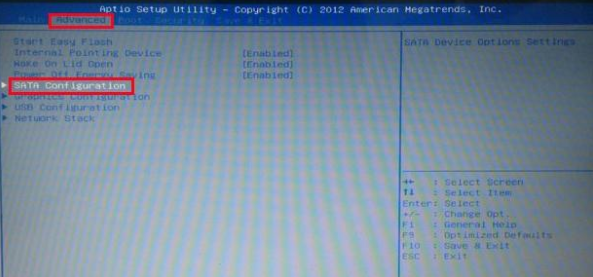 2.进入到该页面后,我们按方向键将其移动到【高级选项】当中,点击下方的【SATAConfiguration】回车。