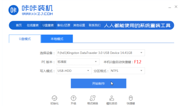 1、首先打开【咔咔装机】重装系统工具,然后准备一个8g内存以上的空白u盘插到电脑当中,在页面中选择【u盘重装系统】,点击开始制作。