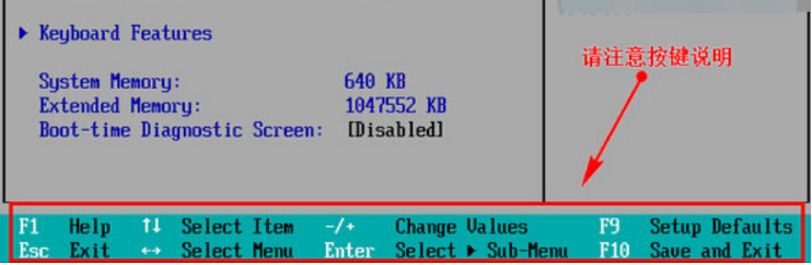 1、我们进入bios界面设置,在该界面我们要进行几个重要的操作,所以我们要了解界面底部注明:键盘上的方向键进行光标移动;回车键表示“确定”;F10表示“保存并退出”。